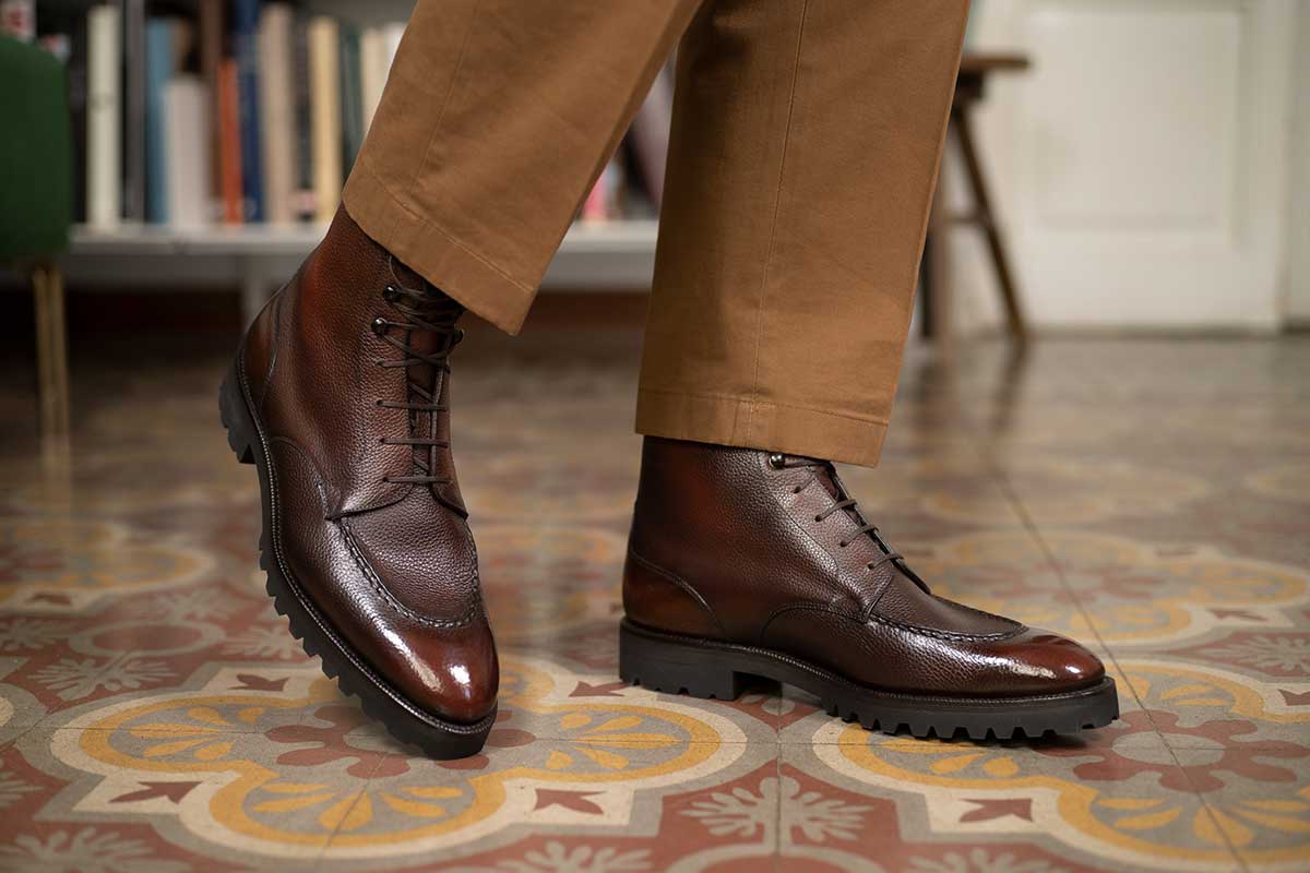 This high-cut sibling of our popular Gaspar Derby showcases an elegantly elongated round toe, a meticulously hand-stitched apron, and refined embroidery on the heel shaft.