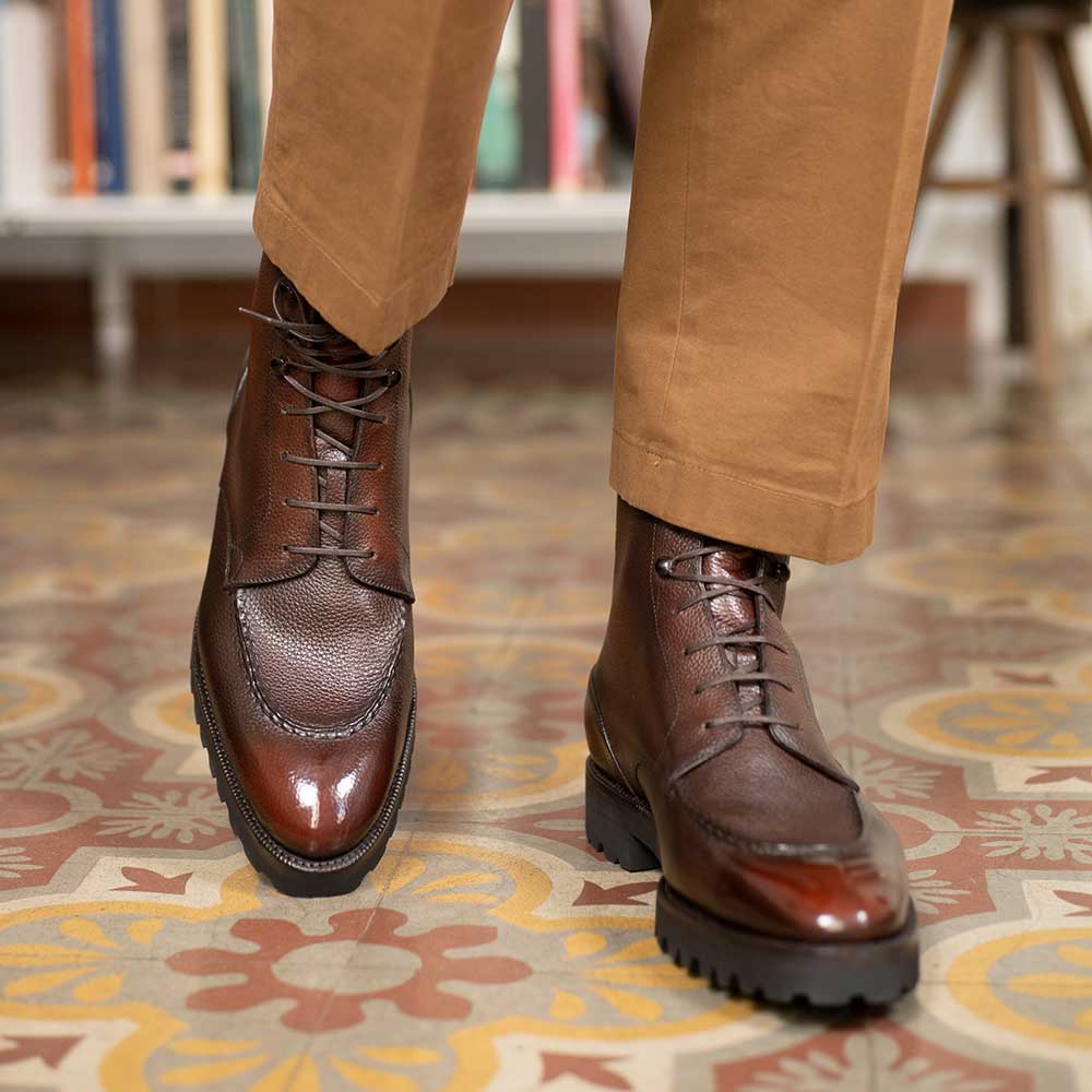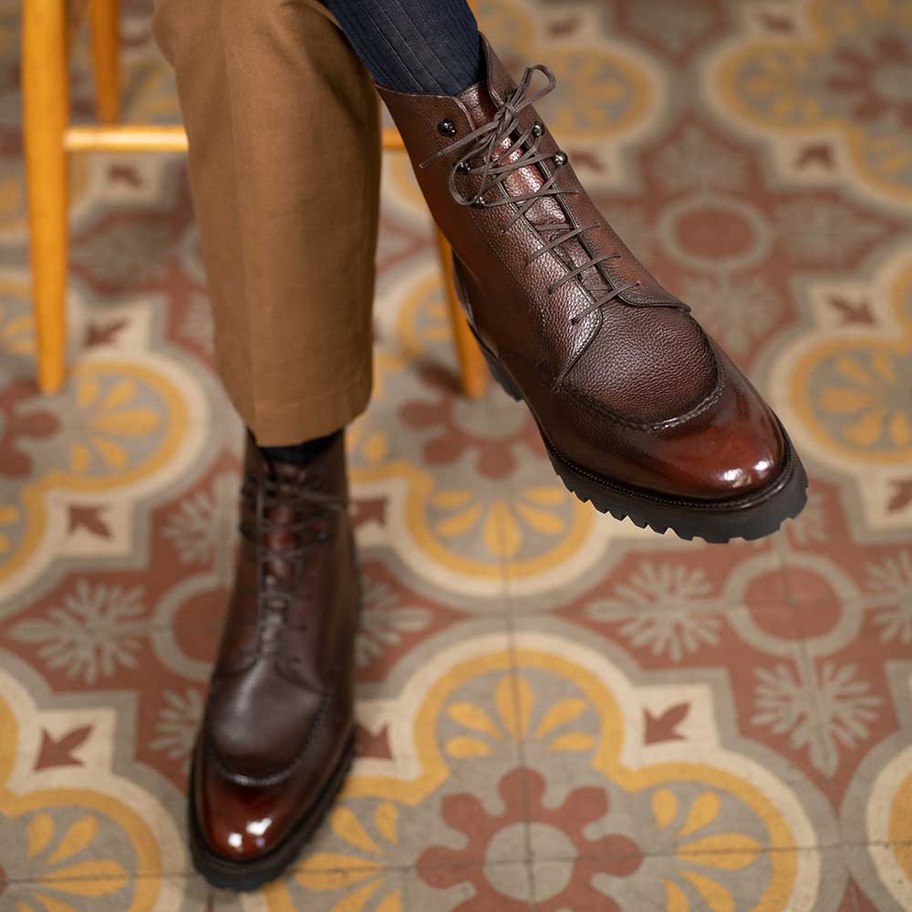 Our signature espresso handmade patina offers a striking contrast that enhances the boot's sophisticated appearance.