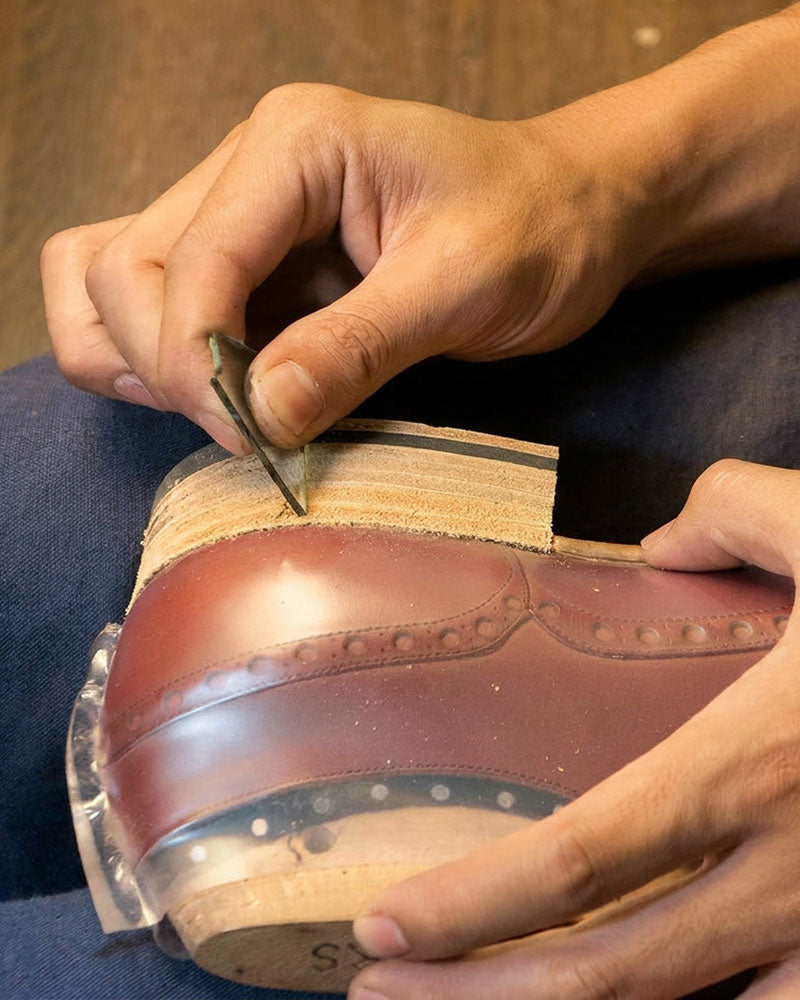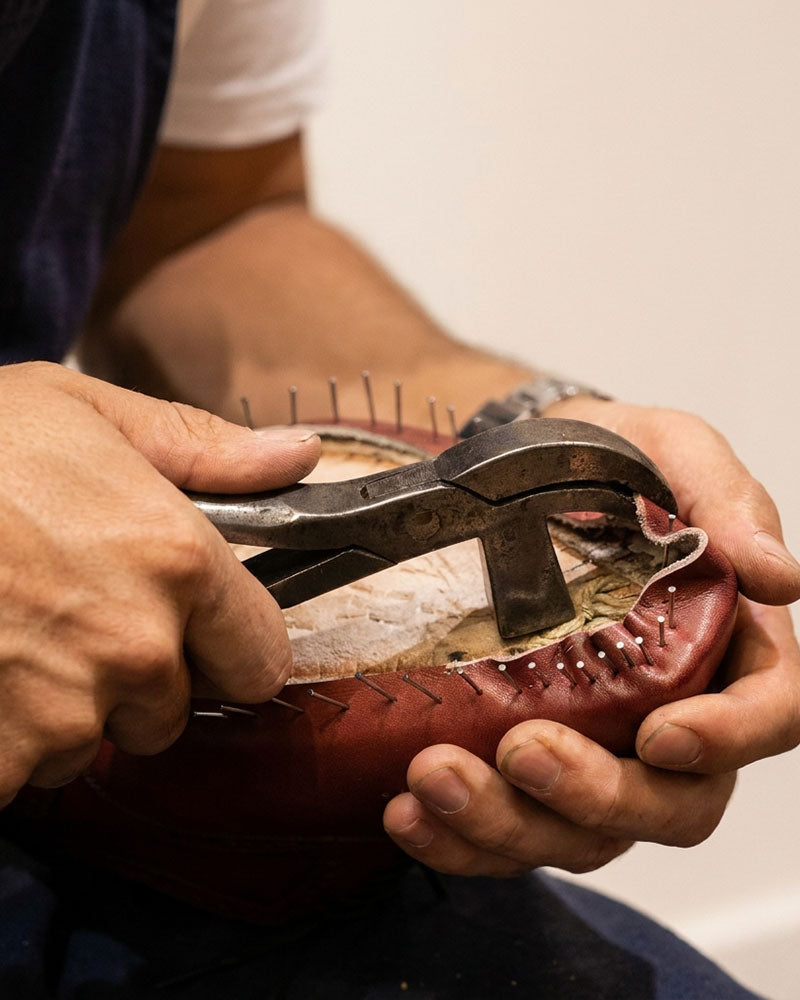 In fully handmade shoemaking, each structural step is carried out by hand.