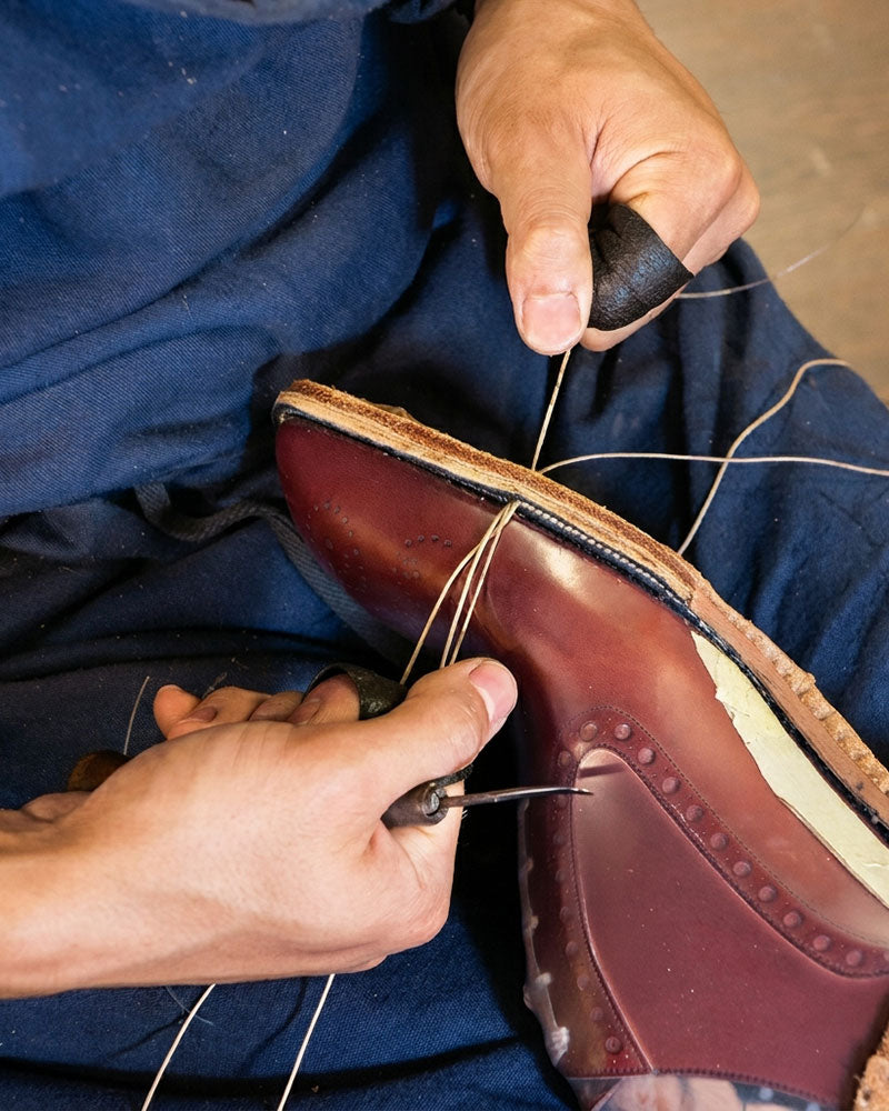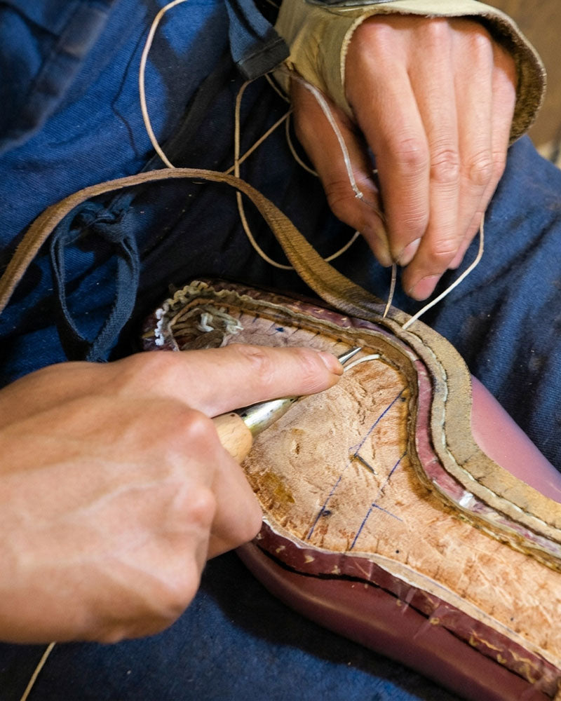 The outsole is then stitched by hand, completing the construction.