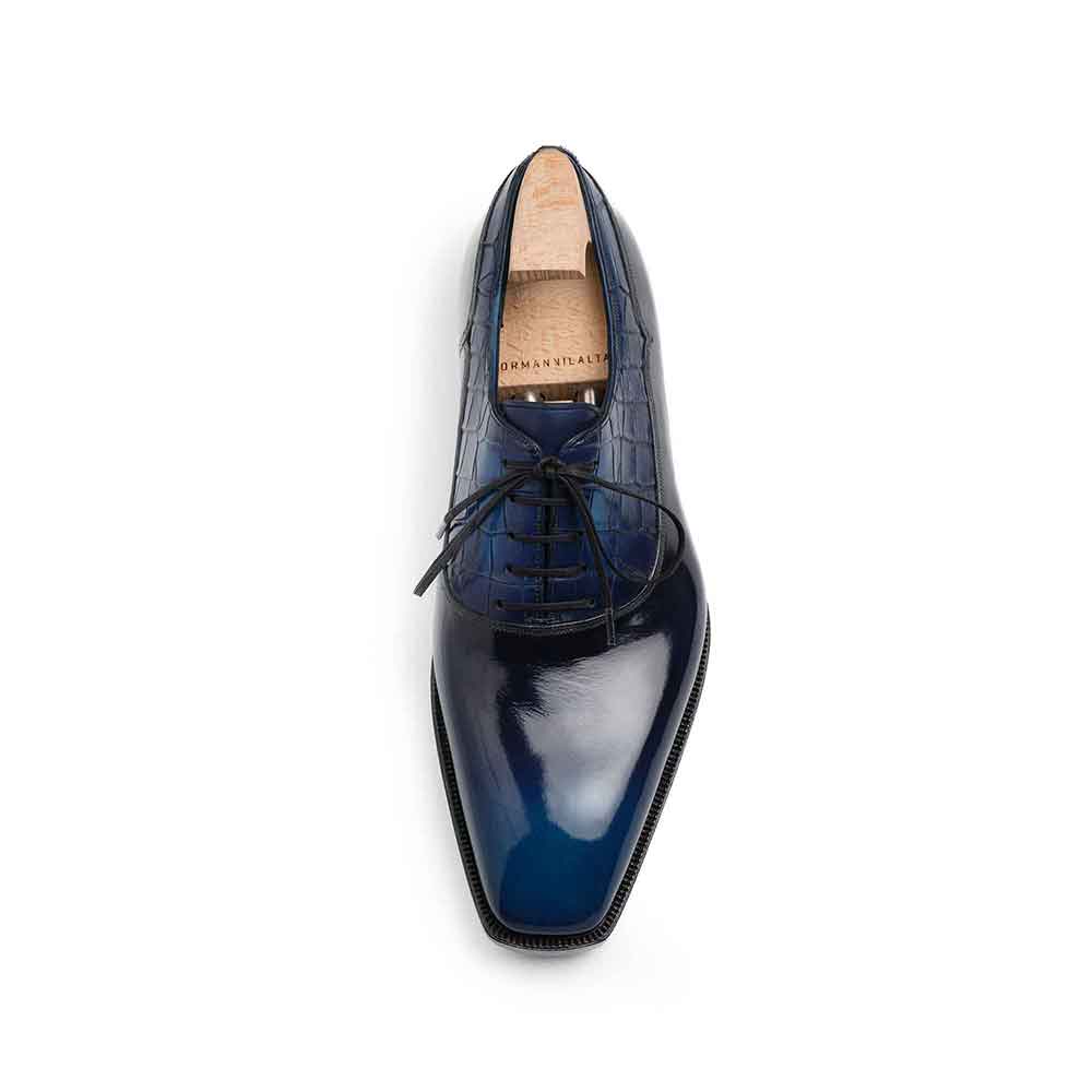 Above it, I placed Nile crocodile sourced from Hermès-owned HCP — its pattern like a natural topography etched by centuries of evolution. Together, they create a conversation of contrasts: smooth against textured, refined against untamed, the familiar language of classic shoemaking spoken with a rare and exotic accent.