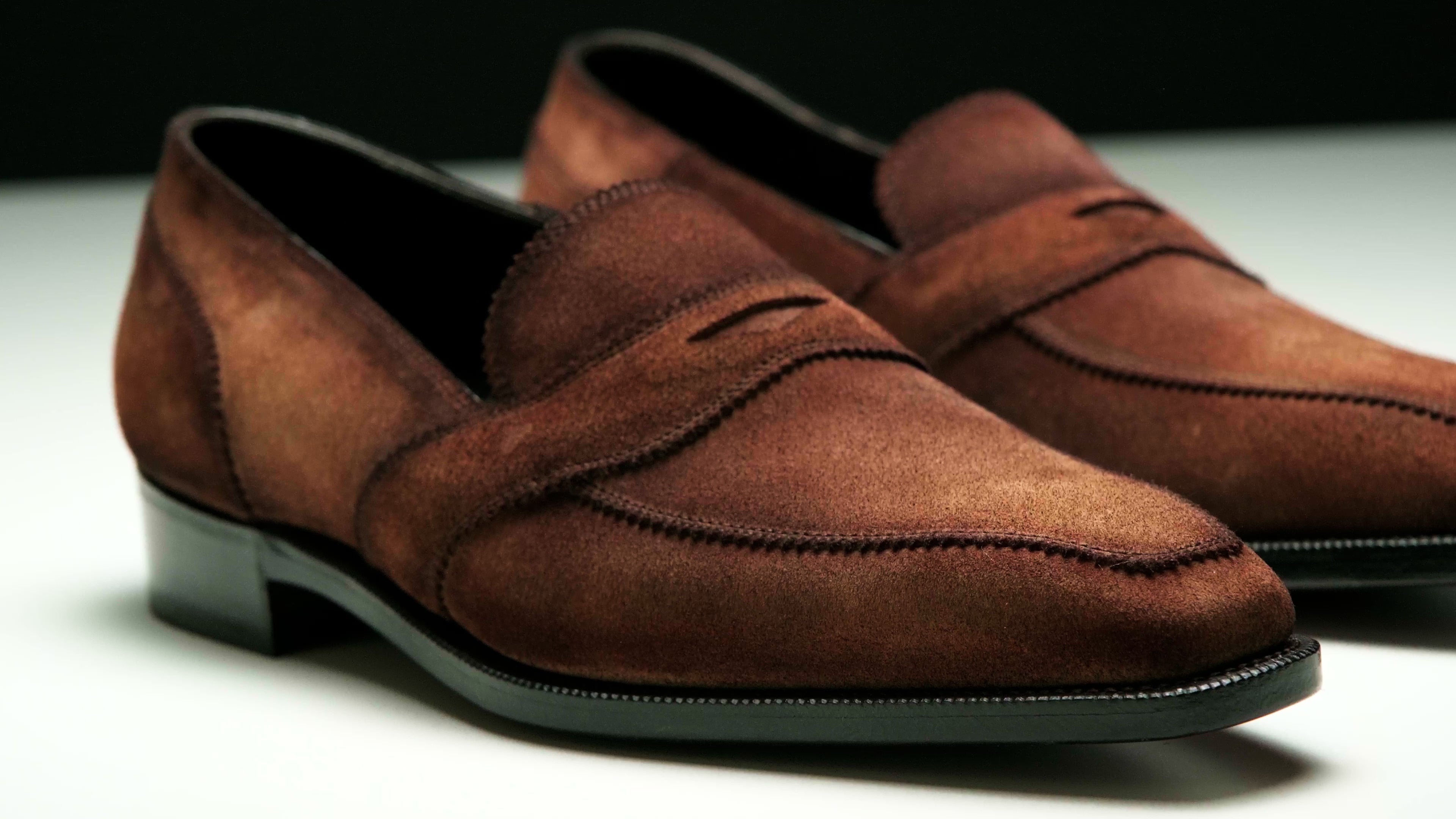 Our James Penny Loafers in repello suede and a handmade Darjeeling patina.
