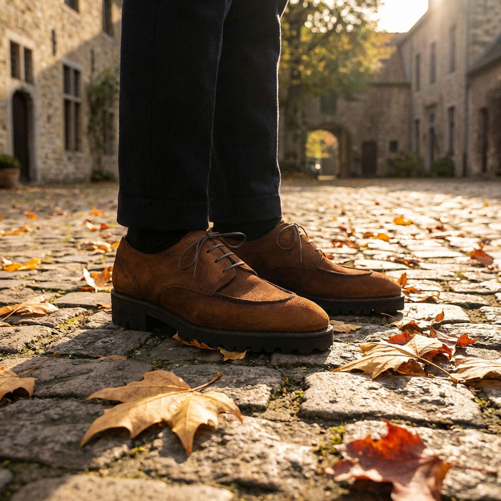 What I enjoy most about working with suede is how honest it is. You cannot hide behind shine. Every brushstroke, every layer of dye, every decision remains visible. The Siena patina allows the suede to breathe while giving it a richness that feels appropriate for a shoe as architectural as the Gaspar.