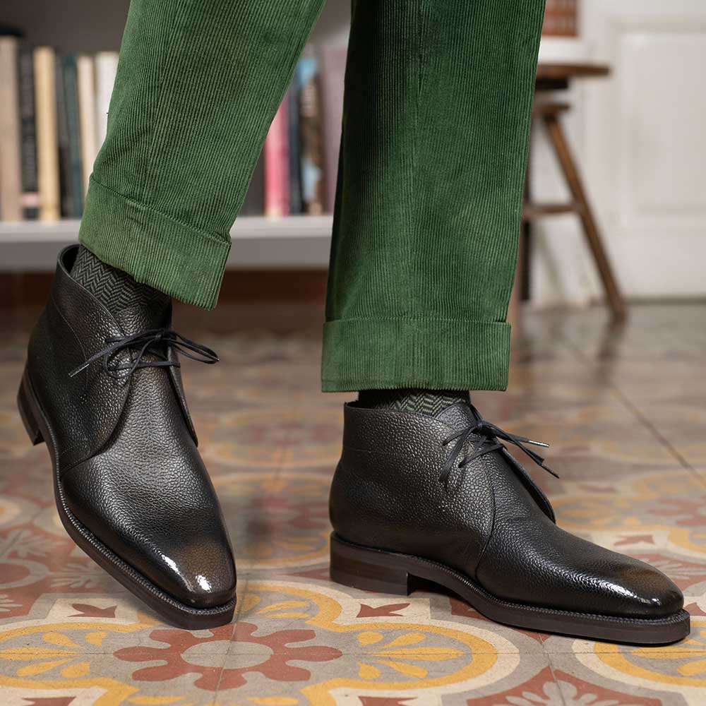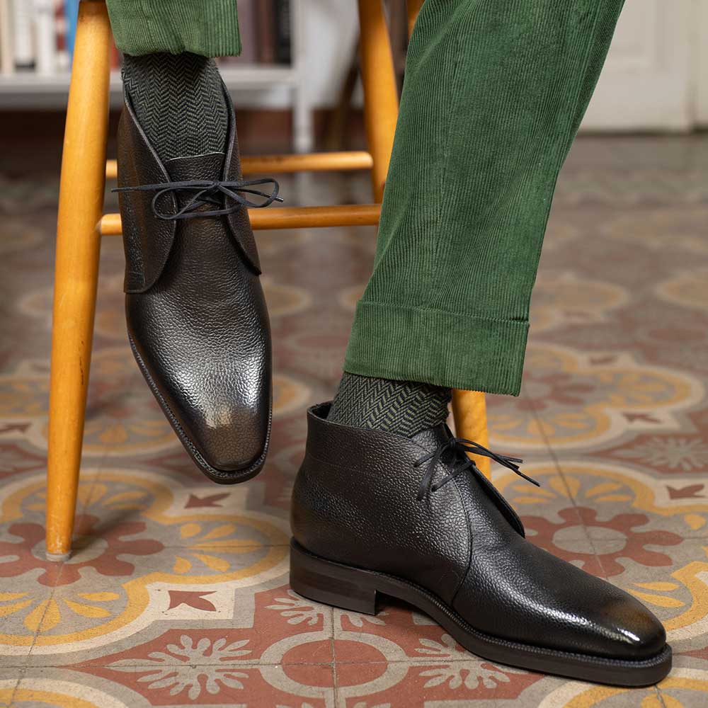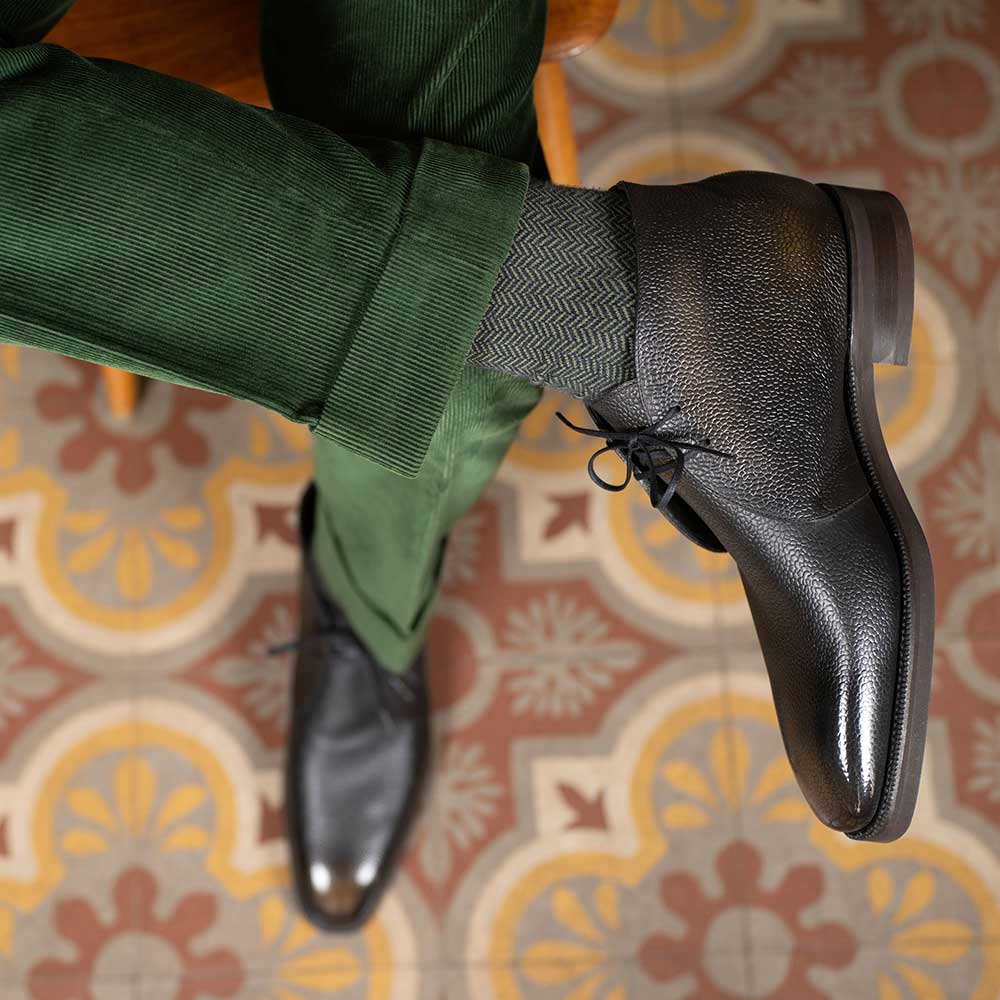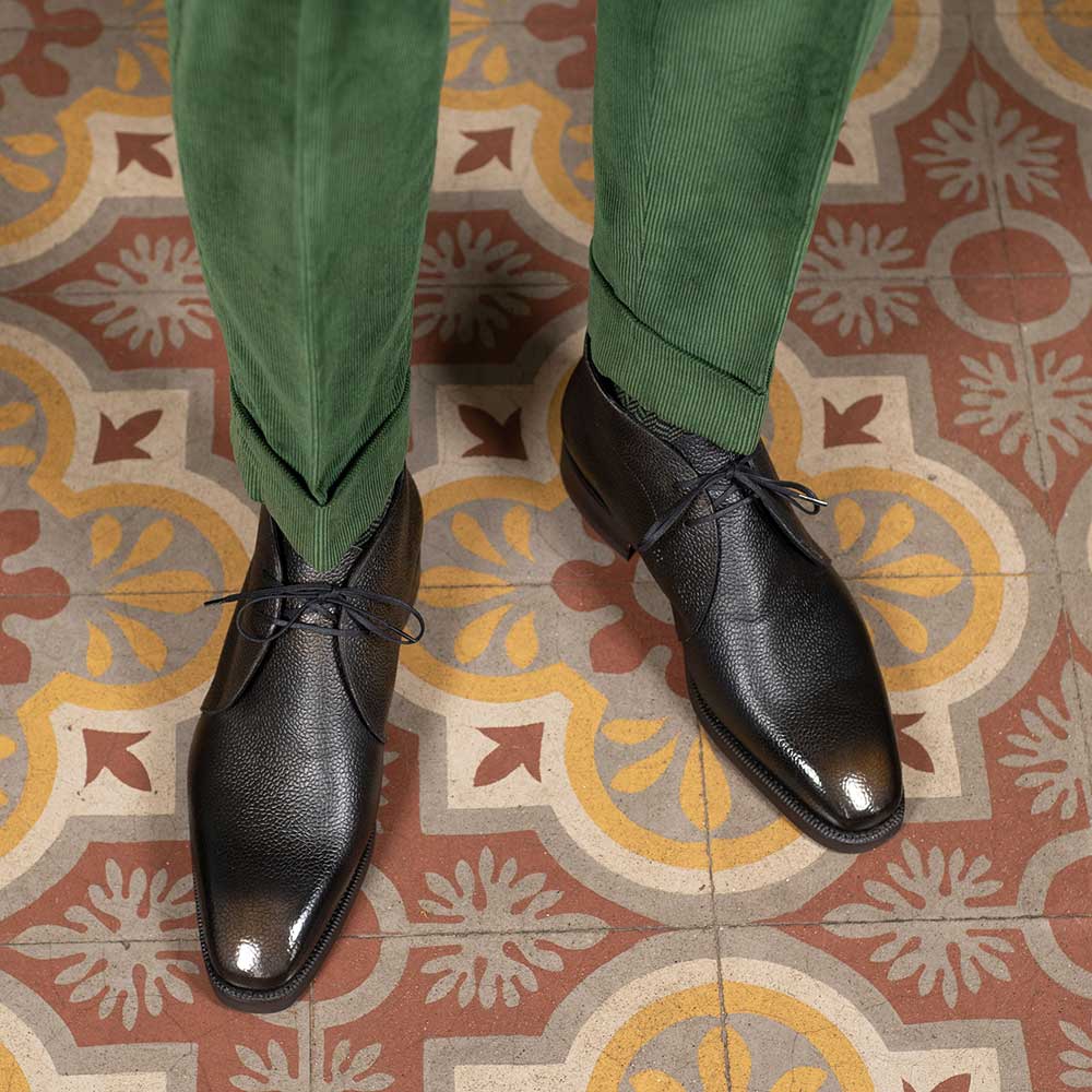 I originally designed the Robert Chukka Boot to transition effortlessly from casual daytime looks to refined evening attire. The two-eyelet lacing and streamlined ankle height lend a modern edge that echoes the simplicity of the Espresso version, but with the added intrigue of Ebony’s unique coloration.
