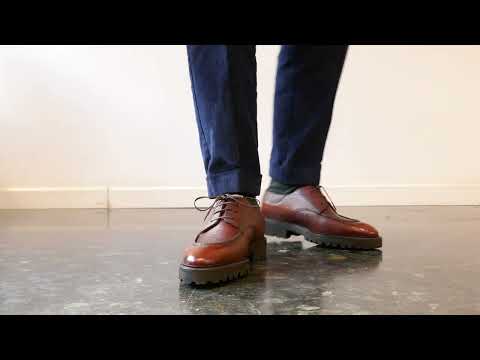 A small batch of our Gaspar U-tip Derby Shoe in a handmade dark caramel patina is now available.